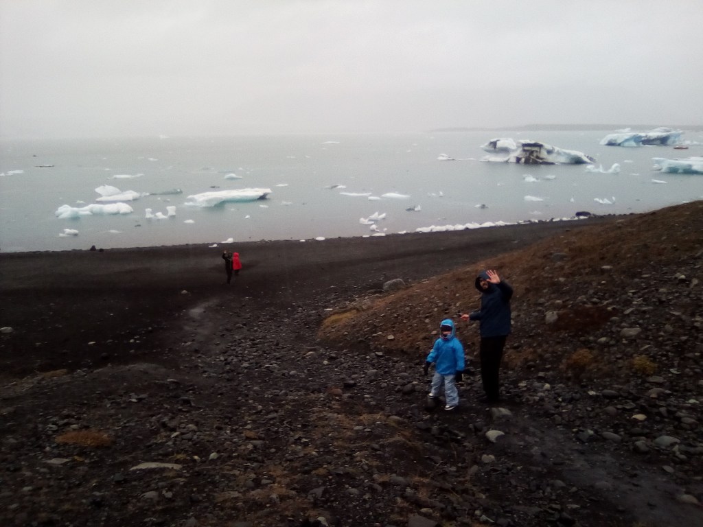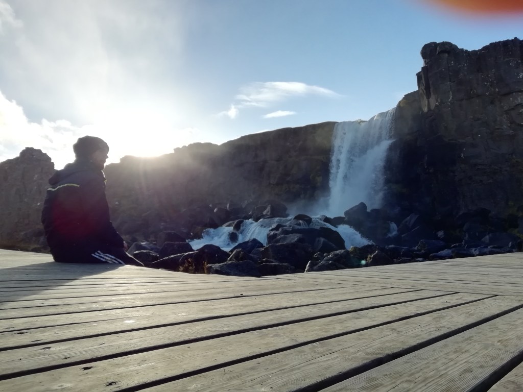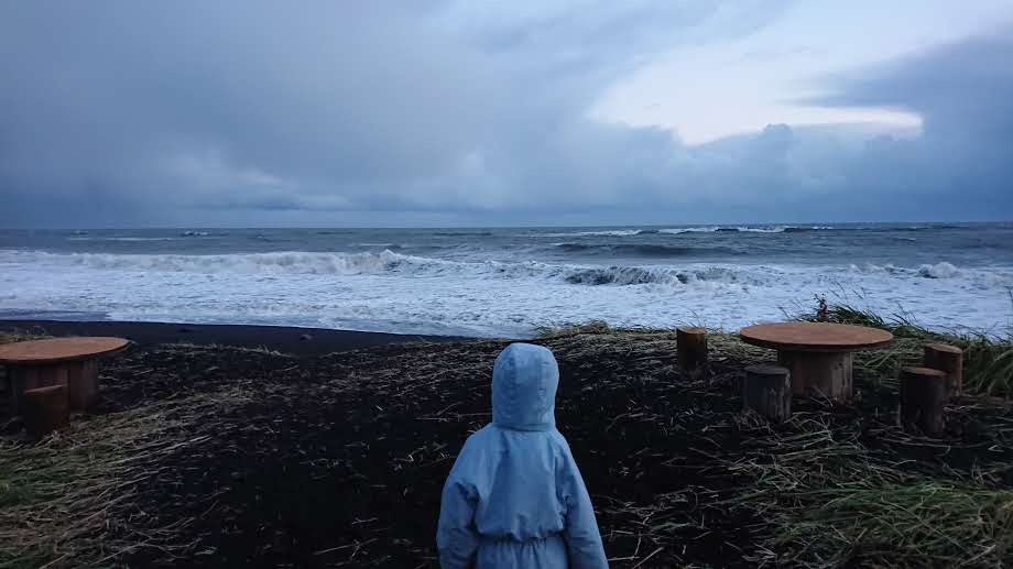 Le jour suivant nous avons pri la direction de Vik. Cette ville se situe au sud de l’Islande. Elle est connue pour sa plage de sable noir. Ci-dessous Lucas admirant l’Océan déchaîné.